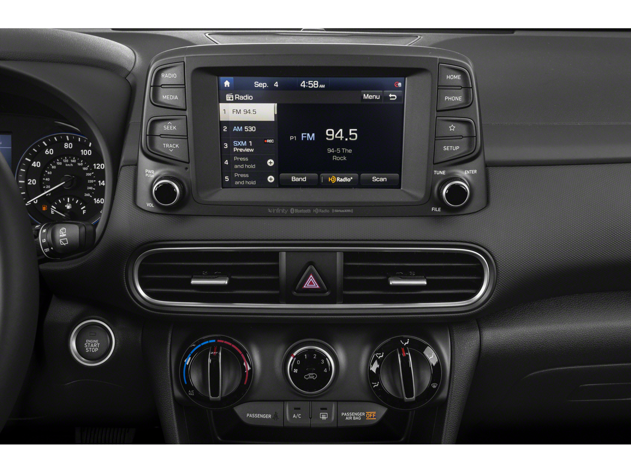 - Radio: AM/FM/MP3/HD Radio/SiriusXM Audio System -inc: 315 Watts, Infinity premium audio w/8 speakers including subwoofer, external amplifier, Blue Link connected car system, Clari-Fi music restoration technology, wireless device charging, VR, 7" LCD touchscreen display, Android Auto, Apple CarPlay, Siri and Google Now support, dual front USB outlets/ auxiliary input jack and Bluetooth®